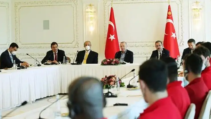 Basına kapalı gerçekleşen görüşmede, Gençlik ve Spor Bakanı Mehmet Muharrem Kasapoğlu, Gençlik ve Spor Bakan Yardımcısı Hamza Yerlikaya, AK Parti Rize Milletvekili Osman Aşkın Bak, Türkiye Basketbol Federasyonu (TBF) Başkanı Hidayet Türkoğlu ile THY Avrupa Ligi ve ING Basketbol Süper Ligi'nde şampiyon olan Anadolu Efes Spor Kulübü'nün Başkanı Tuncay Özilhan, Başantrenörü Ergin Ataman, teknik heyet ve sporcular yer aldı.