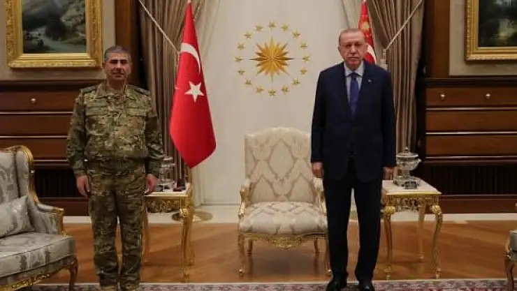 Cumhurbaşkanı Erdoğan'ın, Azerbaycan Savunma Bakanı Zakir Hasanov ve Genelkurmay Başkanı Korgeneral Kerim Veliyev'i kabulü Cumhurbaşkanlığı Külliyesi'nde basına kapalı olarak gerçekleşti.