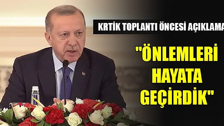 Toplantıda, önümüzdeki dönem için alacakları tedbirlerin müzakeresine ağırlık vereceklerini ifade eden Erdoğan, bugüne kadar hastalığın kontrol altında tutulmasıyla ilgili sağlık önlemleri ve diğer tedbirleri peyder pey hayata geçirdiklerini, geçirmeye de devam ettiklerini söyledi.