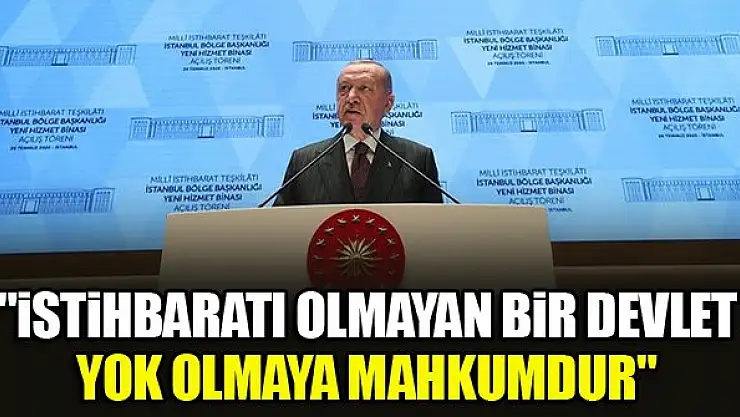 Cumhurbaşkanı Erdoğan İstihbarat Teşkilatı (MİT) İstanbul Bölge Başkanlığı Yeni Hizmet Binası Açılış Töreni'nde, 'İstihbaratı olmayan bir devlet yok olmaya mahkumdur' ifadelerini kullandı.