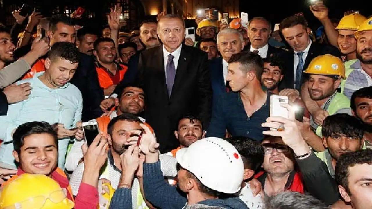 Çalışmalar hakkında bilgi alan Erdoğan, incelemelerinin ardından inşaat işçileriyle hatıra fotoğrafı çektirdi.