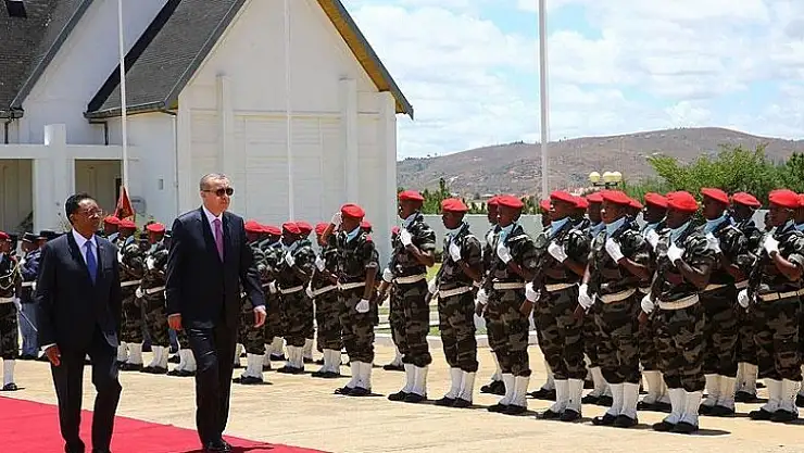 Cumhurbaşkanı Recep Tayyip Erdoğan, resmi ziyaret için geldiği Madagaskar'da Cumhurbaşkanı Hery Rajaonarimampianina tarafından törenle karşılandı.