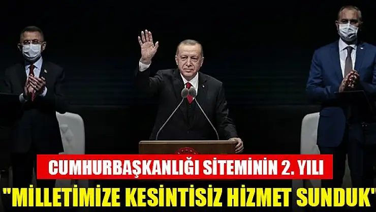 "Son iki yılda Cumhurbaşkanı olarak kendi imzamızla çıkardığımız 64 kararname ve 2 bin 755 karar ile milletimize kesintisiz hizmet sunduk. 9 Temmuz 2018'den bugüne kadar, Ankara ve İstanbul'daki çalışmalarımız dışında, yurt içinde 78 ilimize 114 seyahat gerçekleştirerek, milletimizle kucaklaştık. Aynı şekilde 2018'de 16 ülkeye, 2019'da 14 ülkeye, 2020'de ise 10 ülkeye toplam 47 farklı ziyaret yaparak, uluslararası alanda ülkemizin hak ve menfaatlerinin takipçisi olduk. Ülkemize gelen 98 devlet ve hükümet başkanını misafir ettiğimiz bu dönemde, mevkidaşlarımızla 366 telefon görüşmesi yaparak gündemimizdeki konuları ele aldık. Bölgesel ve küresel hemen tüm sorunların çözümünde Türkiye, her liderin görüşüne başvurduğu, iş birliğini aradığı bir ülke haline gelmiştir."