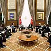 Cumhurbaşkanlığı Sarayı'nda basına kapalı gerçekleştirilen kabulde, Erdoğan'ın eşi Emine Erdoğan da bulundu.