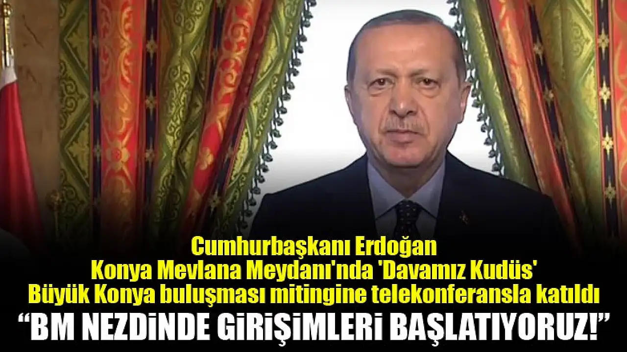 Cumhurbaşkanı Recep Tayyip Erdoğan, Konya'da düzenlenen Kudüs mitingine telekonferans ile katılıp binlerce kişiye seslendi. Erdoğan, 'ABD'nin bu kararının iptali için BM nezdinde girişimler başlatıyoruz. Haksız kararının iptali için çalışacağız' dedi.