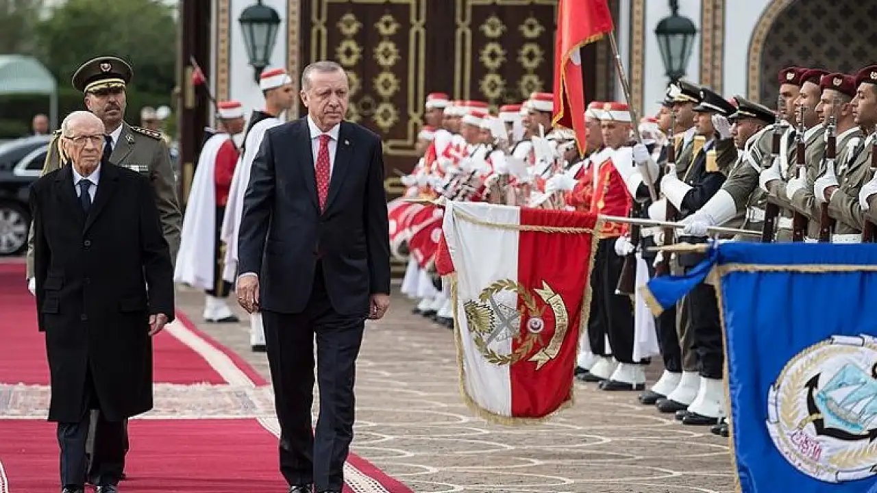 Erdoğan ile mevkidaşı es-Sibsi'nin Tunus Cumhurbaşkanlığı Sarayı'ndaki tören alanında yerlerini almalarının ardından, Türkiye ve Tunus milli marşları çalındı.