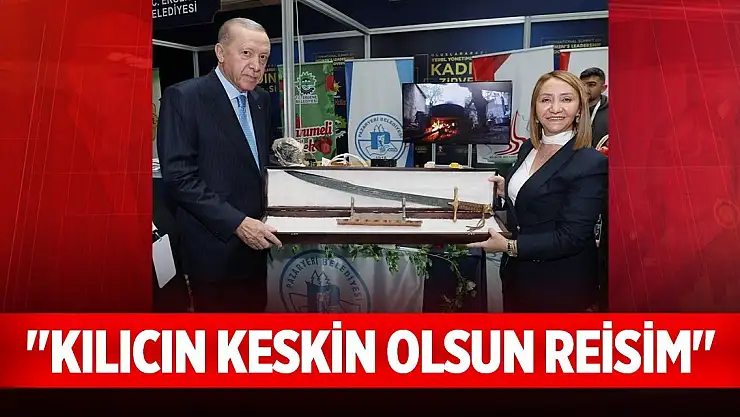 Pazaryeri Belediye Başkanı Zekiye Tekin, Yerel Yönetimlerde Kadın Zirvesi'nde Cumhurbaşkanı Recep Tayyip Erdoğan'a kılıç hediye ederek, 'Kılıcın keskin olsun reisim' dedi.