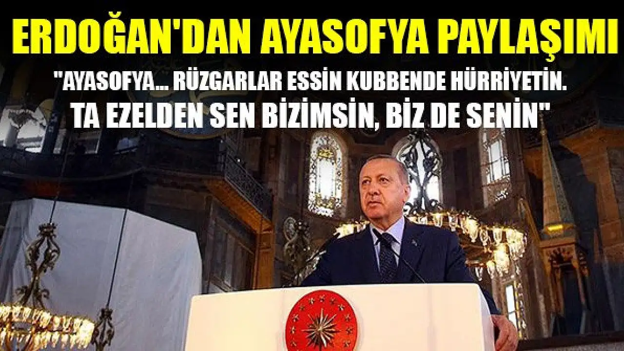 Cumhurbaşkanı Erdoğan Twitter hesabından Ayasofya ile ilgili video paylaşıp, 'Ayasofya... Rüzgarlar essin kubbende hürriyetin. Ta ezelden sen bizimsin, biz de senin' ifadelerini kullandı.