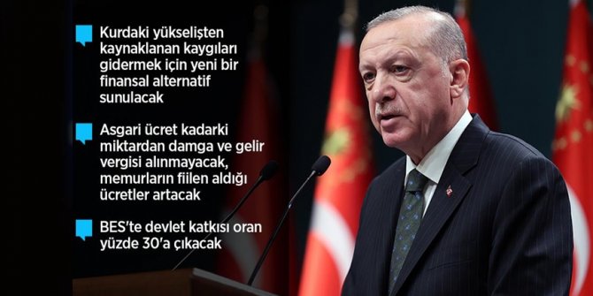 Erdoğan, "KİT'lerden bütçeye aktarılan gelir payları endeksli kamu borç senetleri çıkarılarak yatırımcıların Türk lirası bazlı varlıklara yönelimi teşvik edilecektir." ifadelerini kullandı.