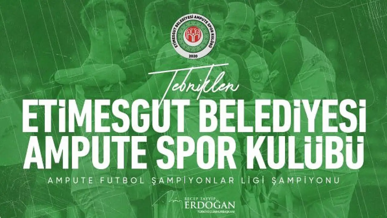 CUMHURBAŞKANI Recep Tayyip Erdoğan, Ampute Futbol Şampiyonlar Ligi şampiyonu olan Etimesgut Belediyesi Ampute Spor Kulübü'nü tebrik etti.