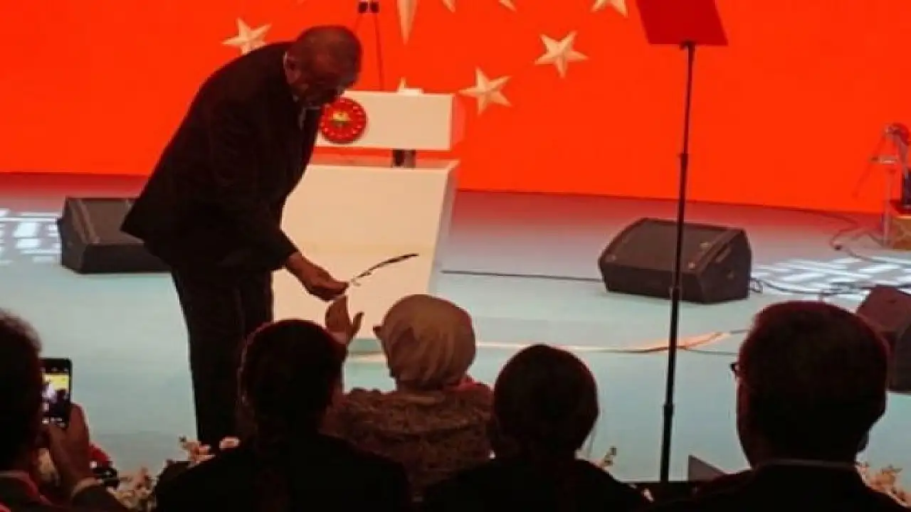 Cumhurbaşkanı Erdoğan törende konuşma yapmak için kürsüye çıktığı sırada eşi Emine Erdoğan'a beklemediği bir sürpriz yaptı. Erdoğan konuşmasına başlamadan önce kürsüdeki zeytin dalını alarak sahnenin önüne geldi. Cumhurbaşkanı Erdoğan zeytin dalını eşi Emine Erdoğan'a hediye etti.