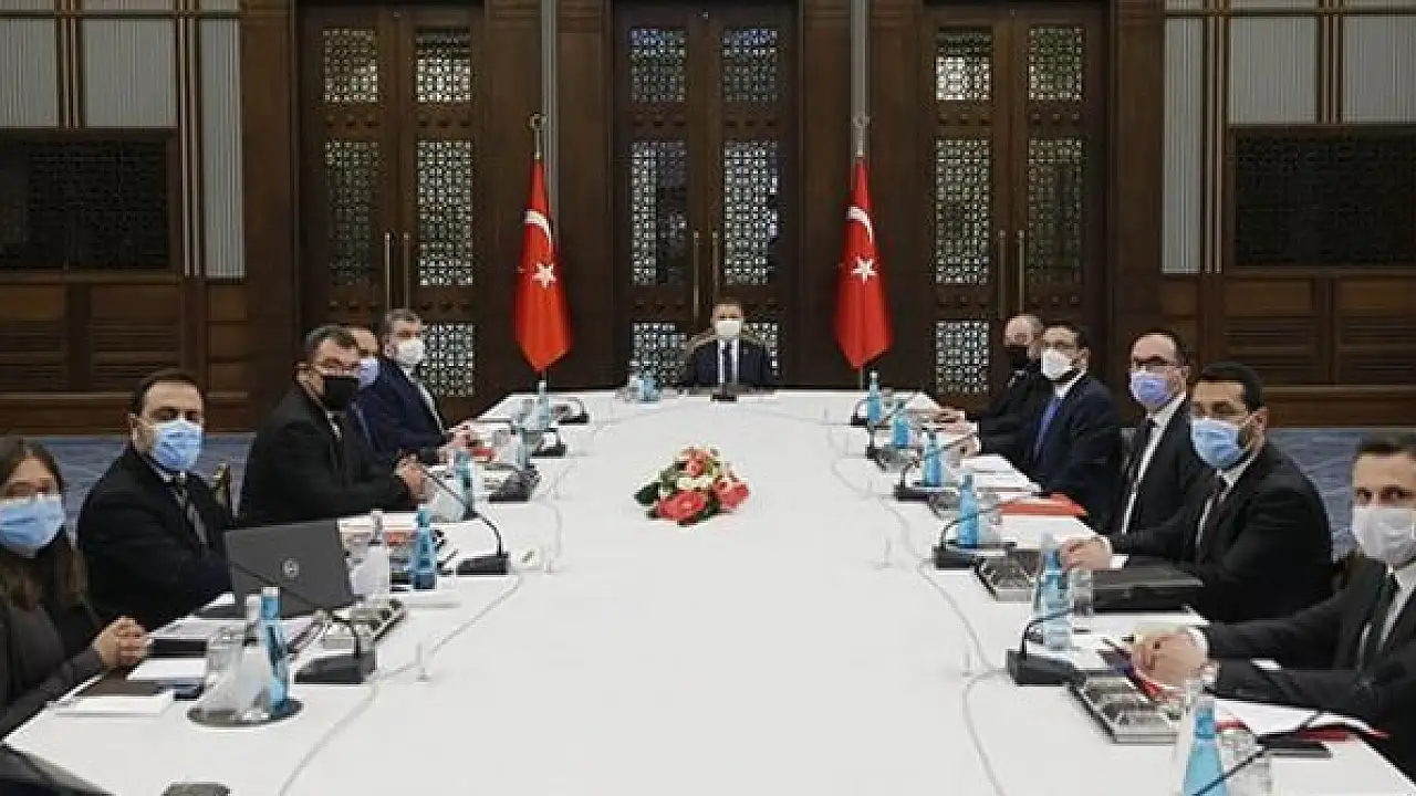 Cumhurbaşkanlığı Külliyesi'ndeki toplantıya, Sağlık Bakanı Fahrettin Koca, Sanayi ve Teknoloji Bakanı Mustafa Varank ile ilgili kurum ve kuruluşların yetkilileri katıldı.