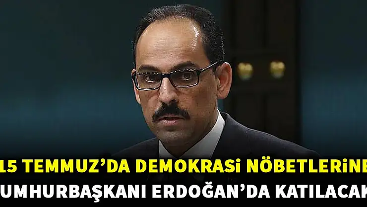 Cumhurbaşkanlığı Sözcüsü Kalın "Cumhurbaşkanımızın çağrısıyla 15 Temmuz'da demokrasi nöbeti süreci başlayacak. Cumhurbaşkanı Erdoğan da katılacak" dedi.