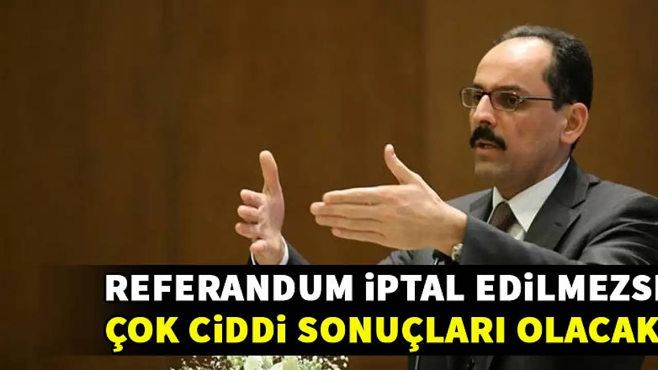 Cumhurbaşkanlığı sözcüsü İbrahim Kalın: 'Referandum iptal edilmezse ciddi sonuçları olacak. Erbil bölgede yeni krizleri tetikleyecek bu vahim hatadan bir an önce dönmeli.'