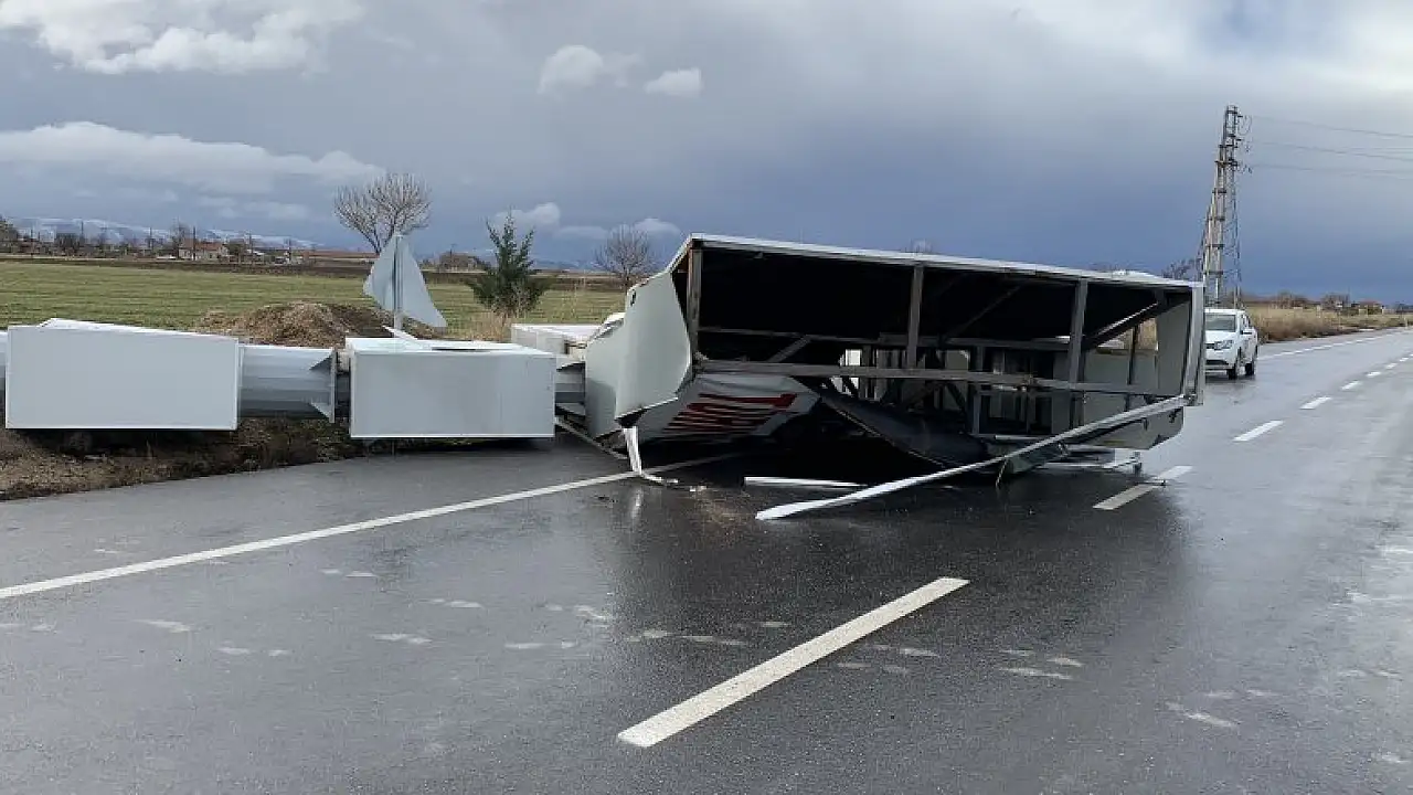 Çumra - Kaşınhanı kara yolu üzerinde bulunan büyük demirden tabela şiddetli rüzgar nedeniyle yola devrildi.