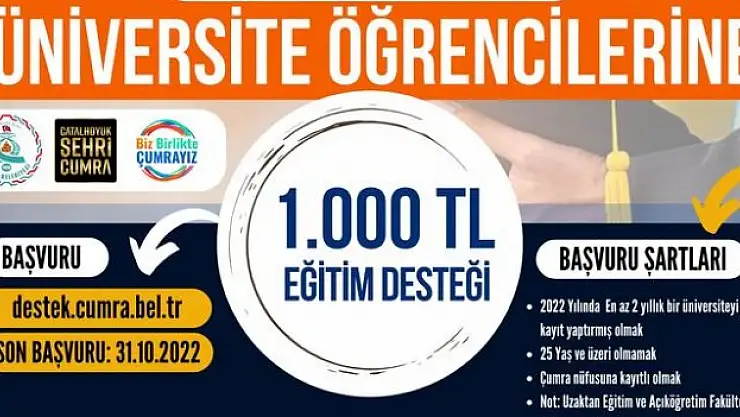 Çumra Belediyesi 2022 yılında Üniversiteyi kazanıp yerleşen öğrencilere bin TL eğitim desteğinde bulunacağını açıkladı. Çumra Belediyesi internet sayfasından yapılacak başvurularda, öğrencilerin 2 yıllık ve üzeri üniversitelere 2022 yılında kayıt yaptırmış olmaları ve 25 yaşını geçmemiş olmaları gerekiyor. Açık öğretim ve uzaktan eğitim yapan öğrenciler destekten faydalanamayacak. Başvuran öğrencilerin nüfus kütüğü ve ikametgah adresinin Çumra'da olması gerekiyor. Son müracat tarihi: 31.10.2022 Pazartesi günü mesai bitimine kadar olarak belirlendi.