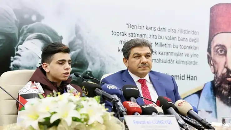 "Bir ay önce Filistin için meydan okuduğu esnada bu kardeşimiz ve O'nun gibi O yollara düşen Filistinli çocuklar, gençler, kadınlar, dünyaya sembol bir görüntü ortaya koydular. 23 tane korkak İsrail askerinin ortasında gözleri kapatılmış ve alnını asla yere dikmeyen, onurlu bir şekilde o askerlere karşı direnen, henüz 16 yaşındaki bir delikanlı görüntüsünü dünya bir taraftan gıptayla, bir taraftan acıyla, bir taraftan da dünyanın tarihi sürecine çok önemli bir imza olarak atıldı. Bu evladımız o görüntüyle dünyaya şunu söyledi, 'Filistin, Filistinliler'indir. Kudüs Filistin'indir ve Kudüs Filistin'inin olarak kalacaktır. Bedenimiz hiçbir zaman geçit vermeyecektir' dedi. Biz de, bu direnişin en önemli sembolü haline gelen Fevzi el-Cüneydi'yi o toprakların emanetçileri olan bu toprakların çocuklarıyla buluşturalım ve Kudüs için gençler bir araya gelsin istedik ve davet ettik. Davetimize icabet ettikleri için çok teşekkür ediyorum."