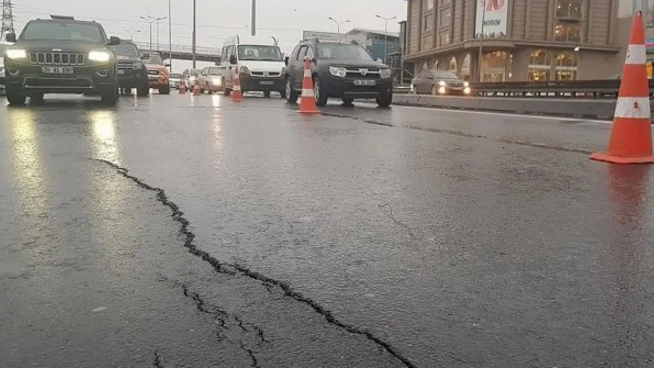 Avcılar'da D-100 Karayolu'nun yan yolunda oluşan çatlaklar nedeniyle trafik akışı tek şeritten sağlanıyor.