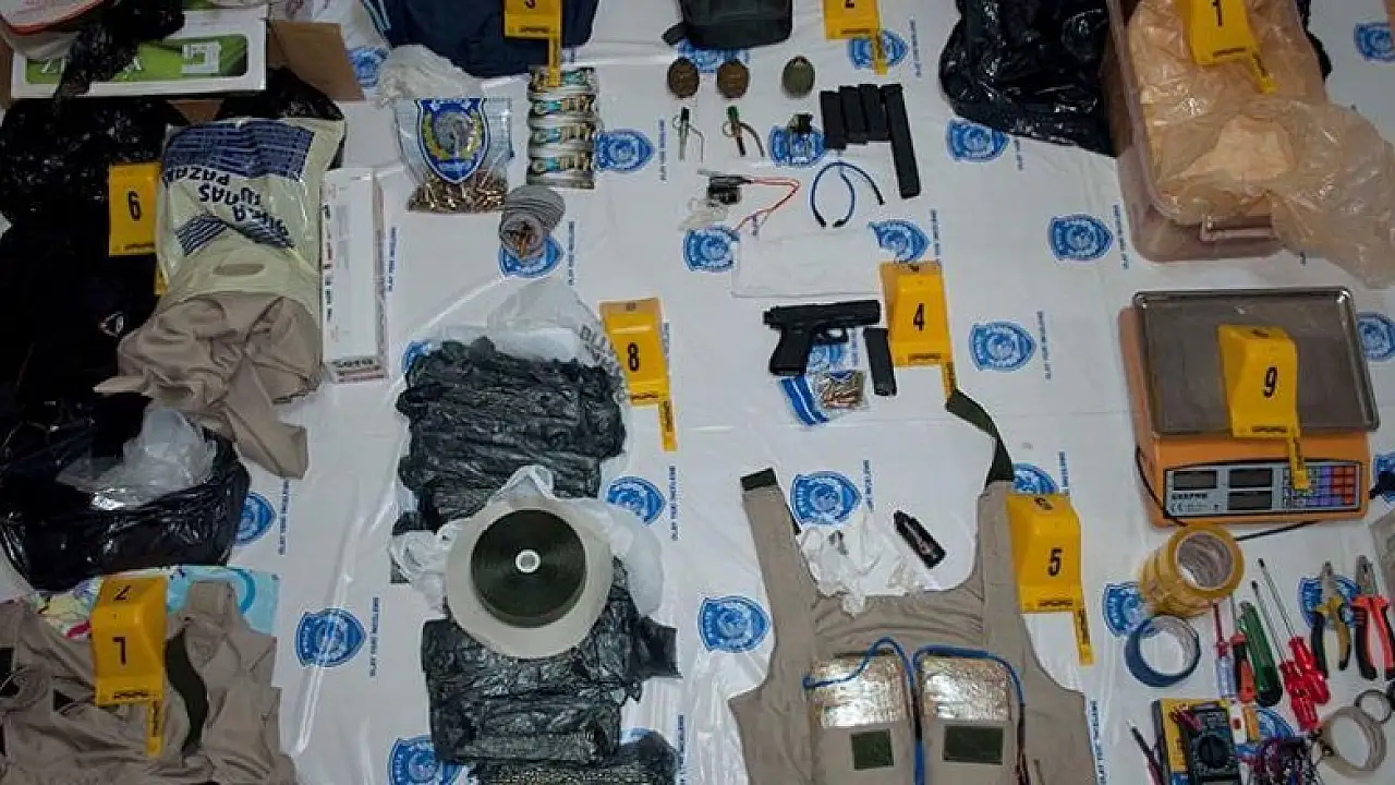 Zanlıların evlerinde yapılan aramada, 20 kilogram TNT cinsi patlayıcı, canlı bomba yeleği, 3 el bombası ve 1 tabanca ele geçirildi.