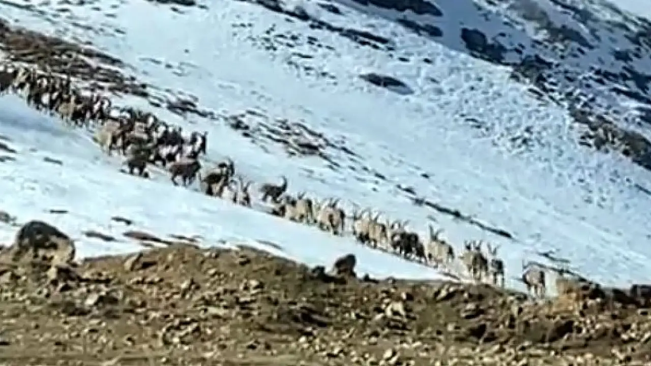 Nesli tükenme tehlikesiyle karşı karşıya bulunan koruma altındaki 100'e yakın dağ keçisi, sürü halinde görüntülendi.