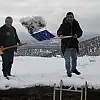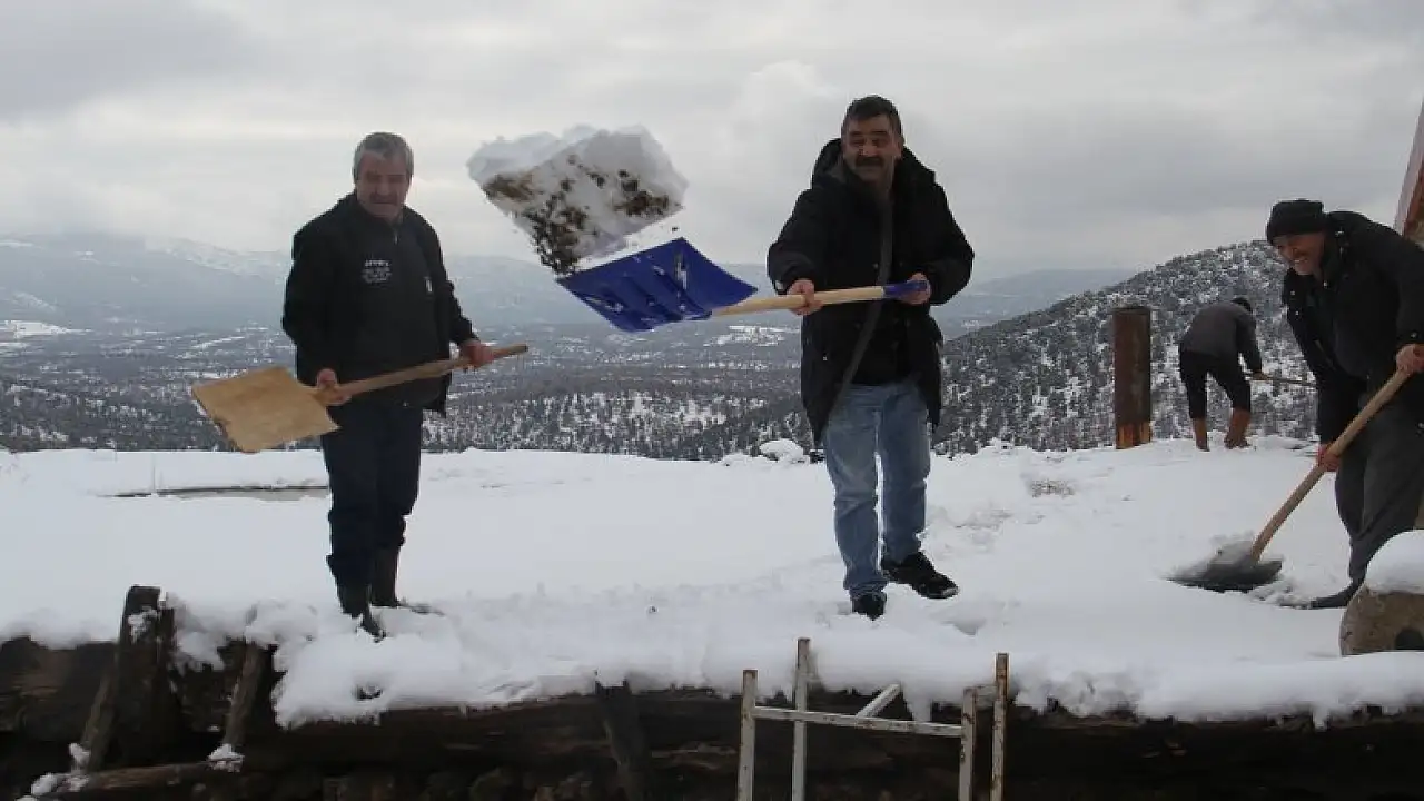 Konya'nın Beyşehir ilçesindeki dağ köylerinde etkili olan kar yağışının ardından, evlerinin damlarına çıkan aileler kar temizliği yaptı, su akıntısı olmaması için taş yuvakla sıkıştırma yaptı