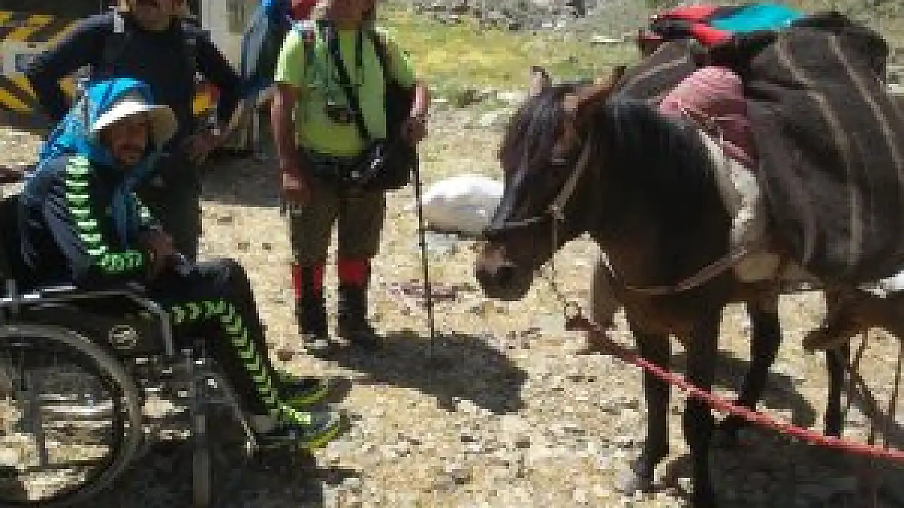 Bedensel engelli Poyraz Kara, 3200 rakımlı Cilo Dağı'na dağcıların sırtında ve zaman zaman da tekerlekli sandalyesiyle ilerleyerek tırmandı.