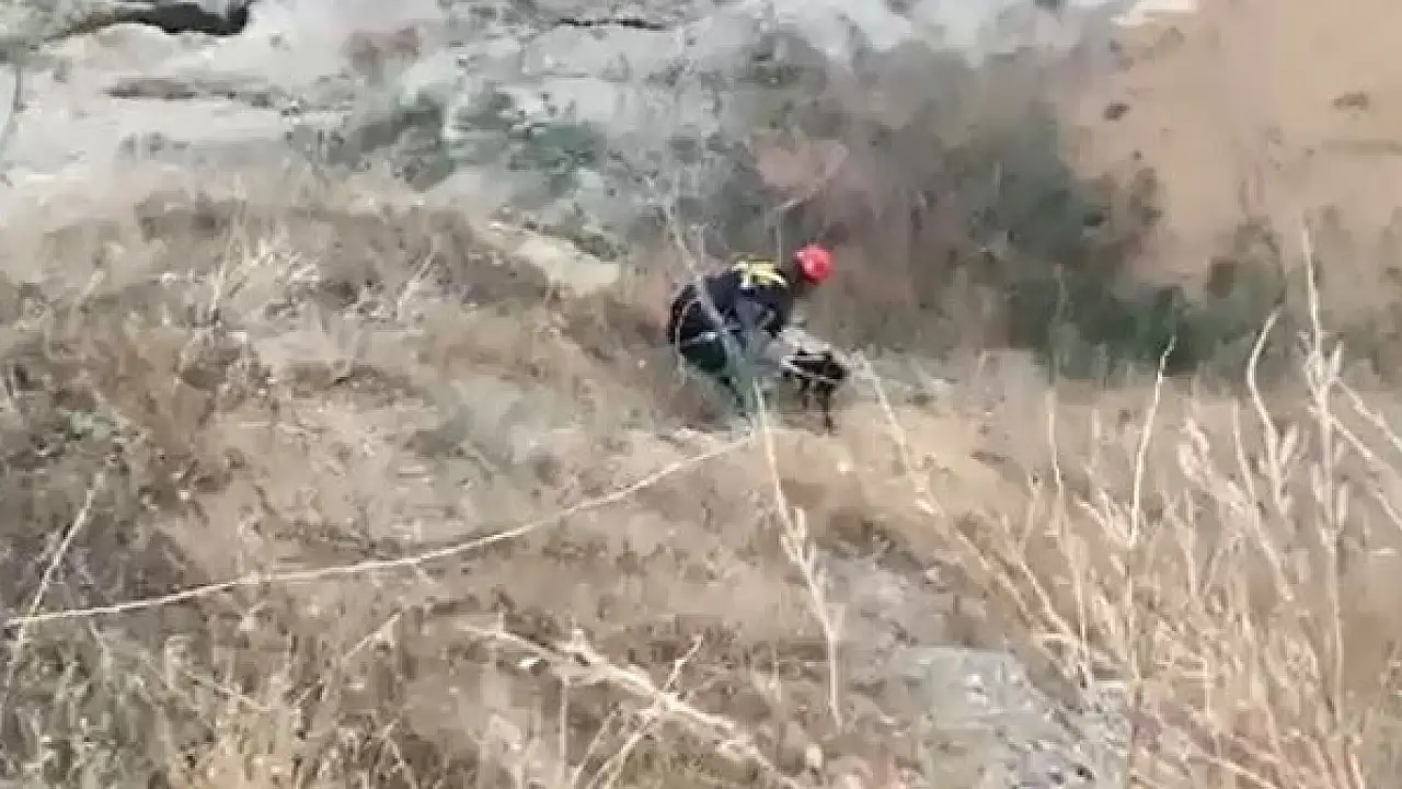 Aydın'ın Nazilli ilçesinde dağlık alanda mahsur kalan bir köpek Aydın Büyükşehir Belediyesi İtfaiye Daire Başkanlığı Nazilli İtfaiye Amirliği ekiplerinin çalışması sonucu kurtarıldı.