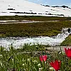 Hava sıcaklıklarının artmasıyla meraların yeşile büründüğü yayla ve dağlarda damar damar uzanan kar örtüsü ile eşsiz bir manzara oluşturuyor.