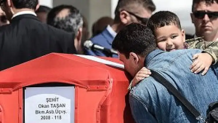 Şehidin naaşı top arabasına götürülmeden önce, eşi Aylin ile oğlu Meriç Taşan tabuta sarıldı. Babasının tabutu götürülürken, oğlu Meriç el salladı.
