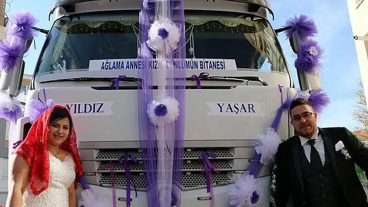 Dorsesi çıkarılıp Türk bayrakları ve renkli şeritlerle süslenerek gelin arabası yapılan tırın direksiyonuna geçen Yaşar Karataş (24), konvoyla Yıldıztepe Mahallesi Dumlupınar Caddesi'nde oturan gelin Yıldız Erayık'ın (23) evine geldi.