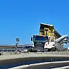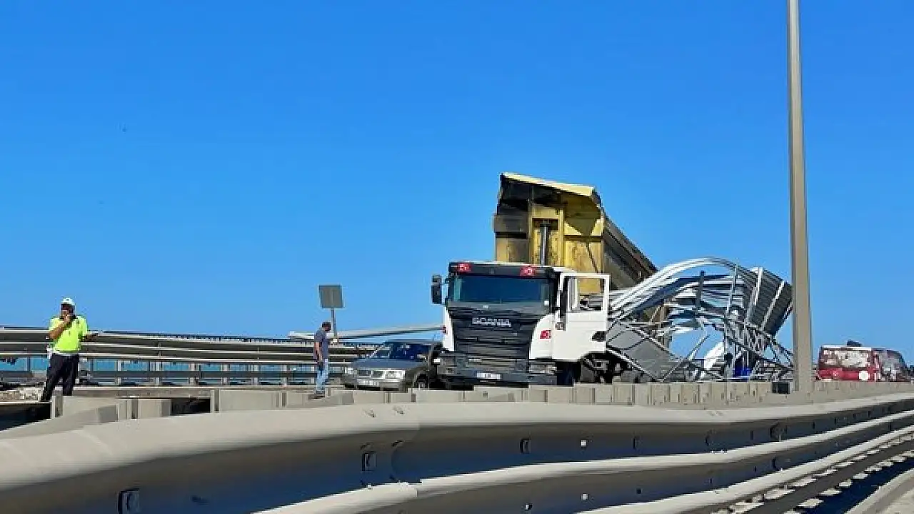 Kamyonun damperi, bir süre sonra güzergahtaki yön tabelasına çarptı.