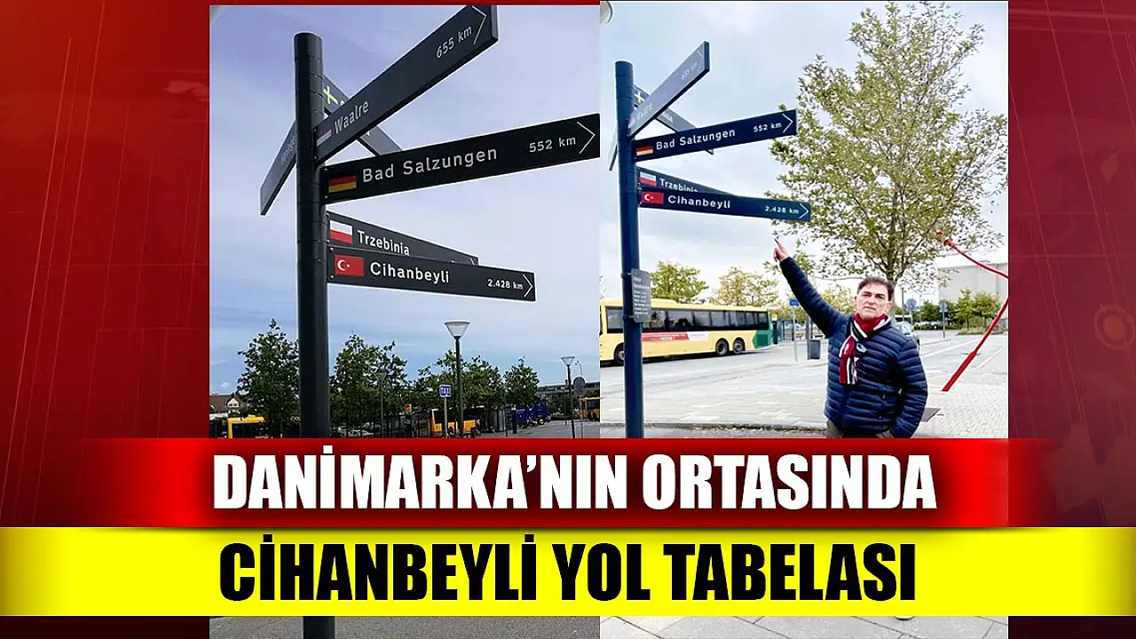 Danimarka'nın başkenti Kopenhak İshoj kentinde Konya'nın Cihanbeyli ilçesini kilometresiyle birlikte gösteren yol tabelası görenleri hayrete bırakıyor.