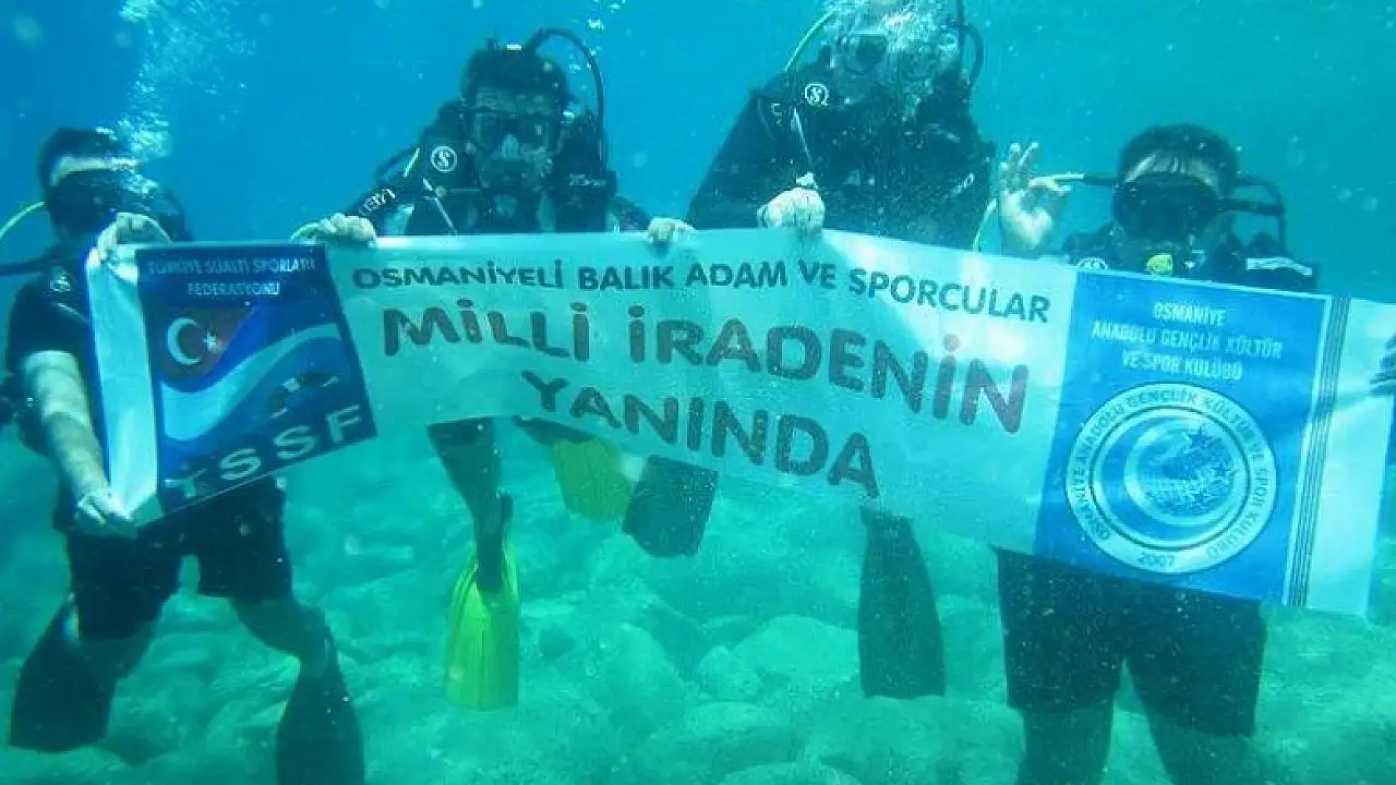 Türkiye Sualtı Sporları Federasyonu Osmaniye İl Temsilciliğine bağlı balık adamlar, Fetullahçı Terör Örgütü'nün (FETÖ) darbe girişimine deniz altında "Milli İradenin Yanındayız" pankartı açarak tepki gösterdi.
