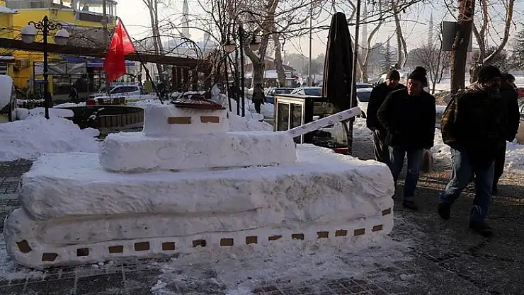 Tokat'ın Niksar ilçesinde yaşayan esnaflık yapan Yasir ve Şehit Sarıca kardeşler, çevredeki vatandaşların da yardımıyla topladıkları yaklaşık 4 ton kardan tank yaparak, üstüne Türk bayrağı astı.