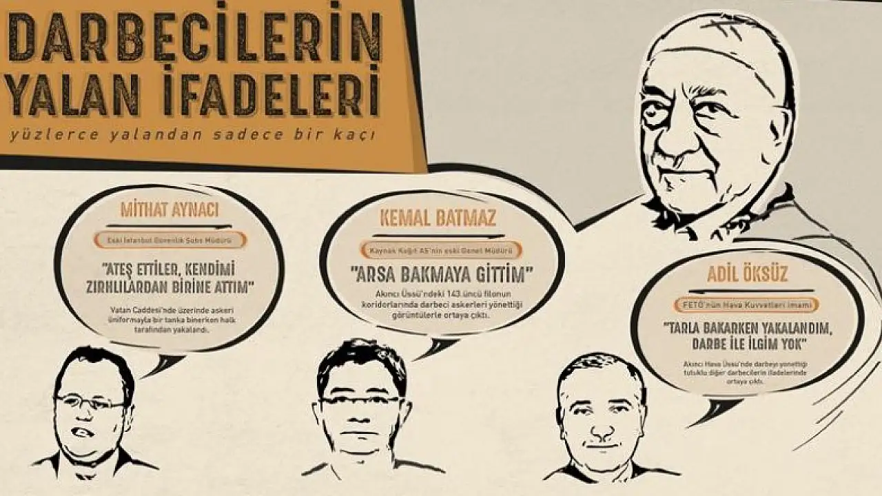 "Akıncı Üssü'ne gezmeye giden, güvenlik kameralarını korumak için söken, terörle mücadele için F16 ile TBMM'yi bombalayan" darbecilerin yalanlarını ise görüntüler ve deliller bir bir çürütüyor.