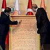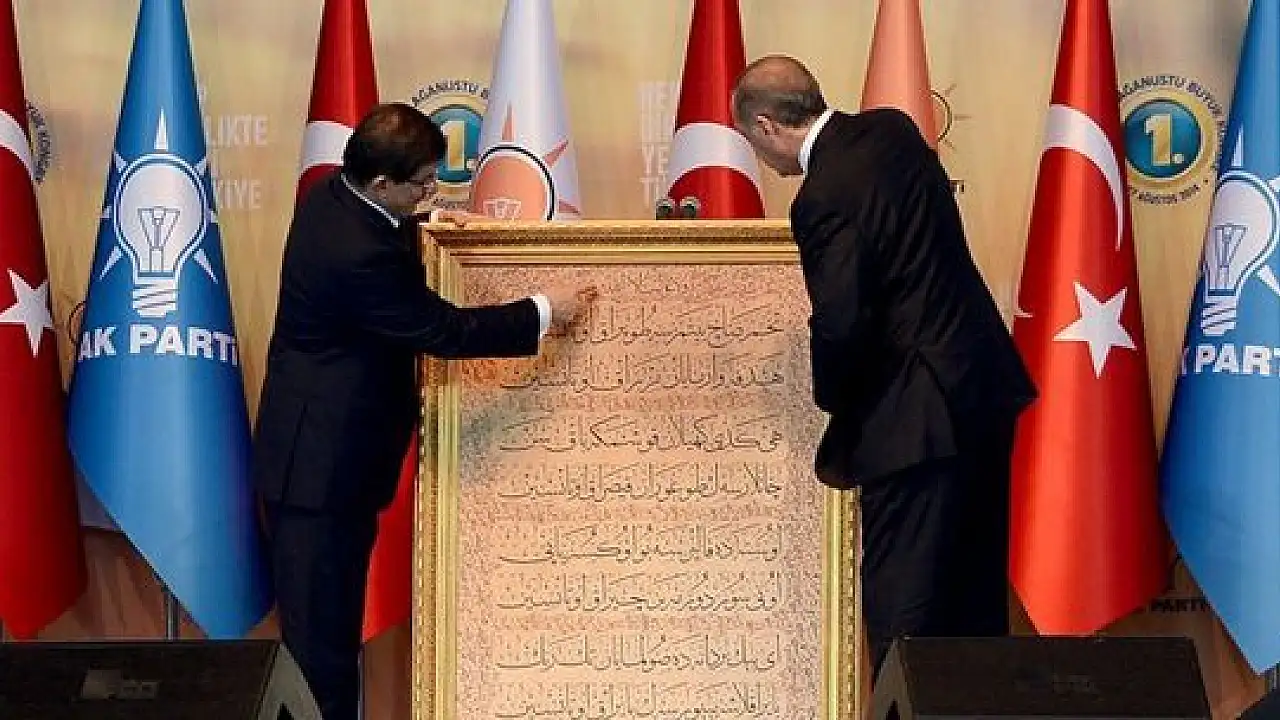 AK Parti'de 1245 delegenin oyuyla tek Genel Başkan Adayı olan Ahmet Davutoğlu, konuşması sırasında Türkiye'nin seçilmiş ilk Cumhurbaşkanı olan selefi Tayyip Erdoğan'a Osmanlıca yazılmış bir tablo hediye etti.