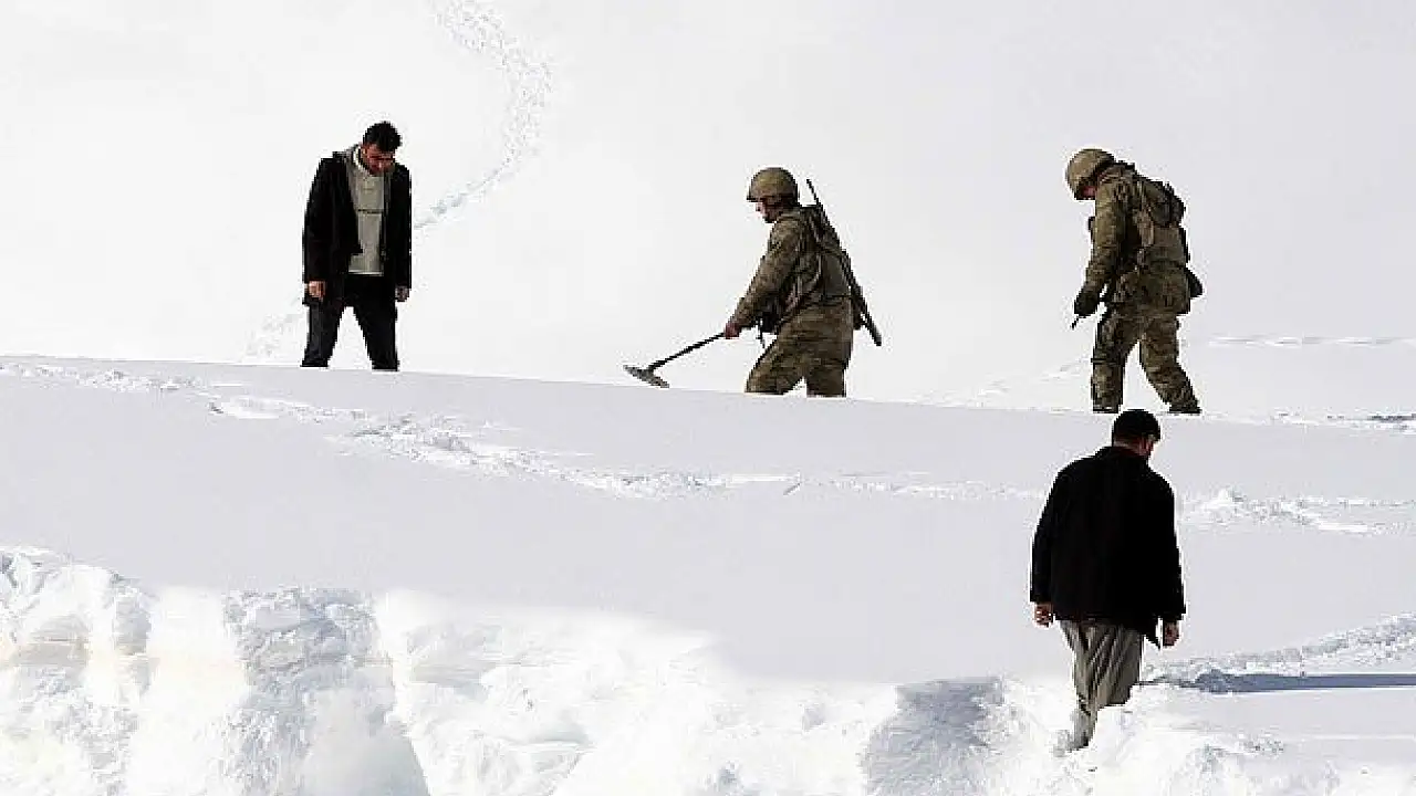 Kar yağışı nedeniyle ulaşıma kapanan Hakkari-Şırnak karayolunda, kar altında kalan araçlar askerler tarafından dedektörlerle aranıyor.