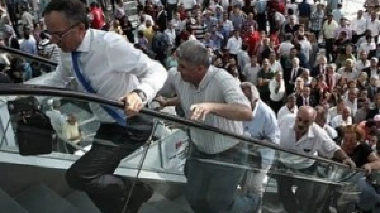 CHP'nin 18. Olağanüstü Kurultayı'nın gerçekleştiği ATO Kongre Merkezi'ne gelen partililerden bazıları ters yönde yürüyen merdivenleri çıkmaya çalıştı.
