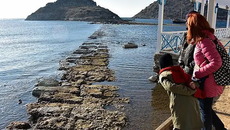 Yılın aralık ve ocak aylarında birkaç kez yaşanan olayda, deniz suyunun çekilmesiyle milattan önce 4. yüzyılda yapılan ve Mydos (Tavşan) Adası'na kadar uzanan şehir surları ortaya çıkıyor.