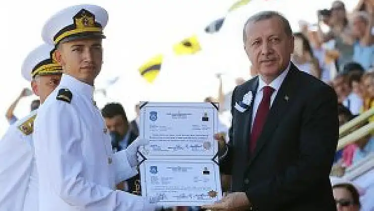 Erdoğan, tören alanındaki öğrencileri, "Deniz Harp Okulu, merhaba! Yeni rütbeleriniz hayırlı olsun" diyerek selamladı.
