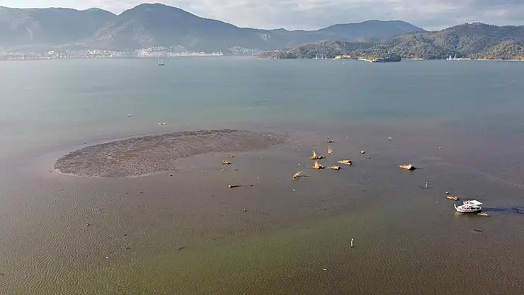 Fethiye Körfezi'nde deniz suyunun çekilmesiyle oluşan görüntü, kordona gezintiye gelenleri şaşırttı. Foça Mahallesi Çalış mevkisinde bölgede yaşayanlar ve ziyaretçiler ortaya çıkan manzaranın fotoğraflarını çekti.