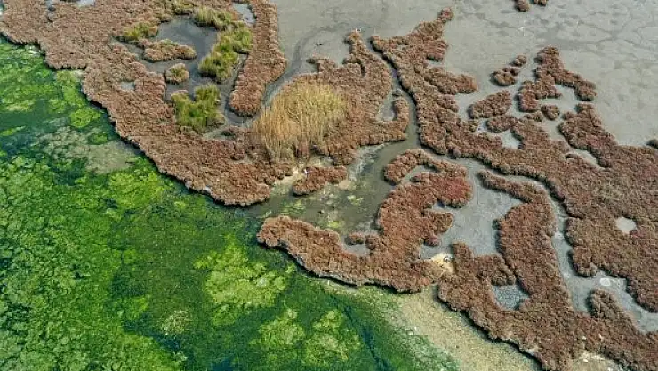 Flamingo başta olmak üzere çok sayıda kuşun yaşadığı lagünde, suyun yüzeyi deniz yosunlarıyla örtüldü.