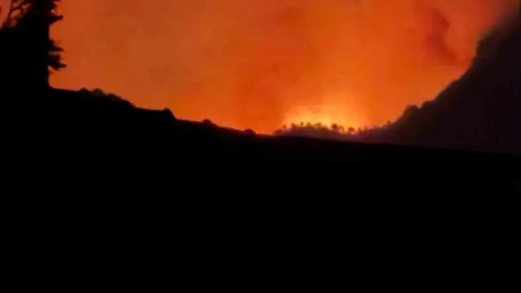 Yangın, gece saatlerinde devam ederken, ortaya çıkan görüntülerde alevlerin zaman zaman yükseldiği görülüyor.