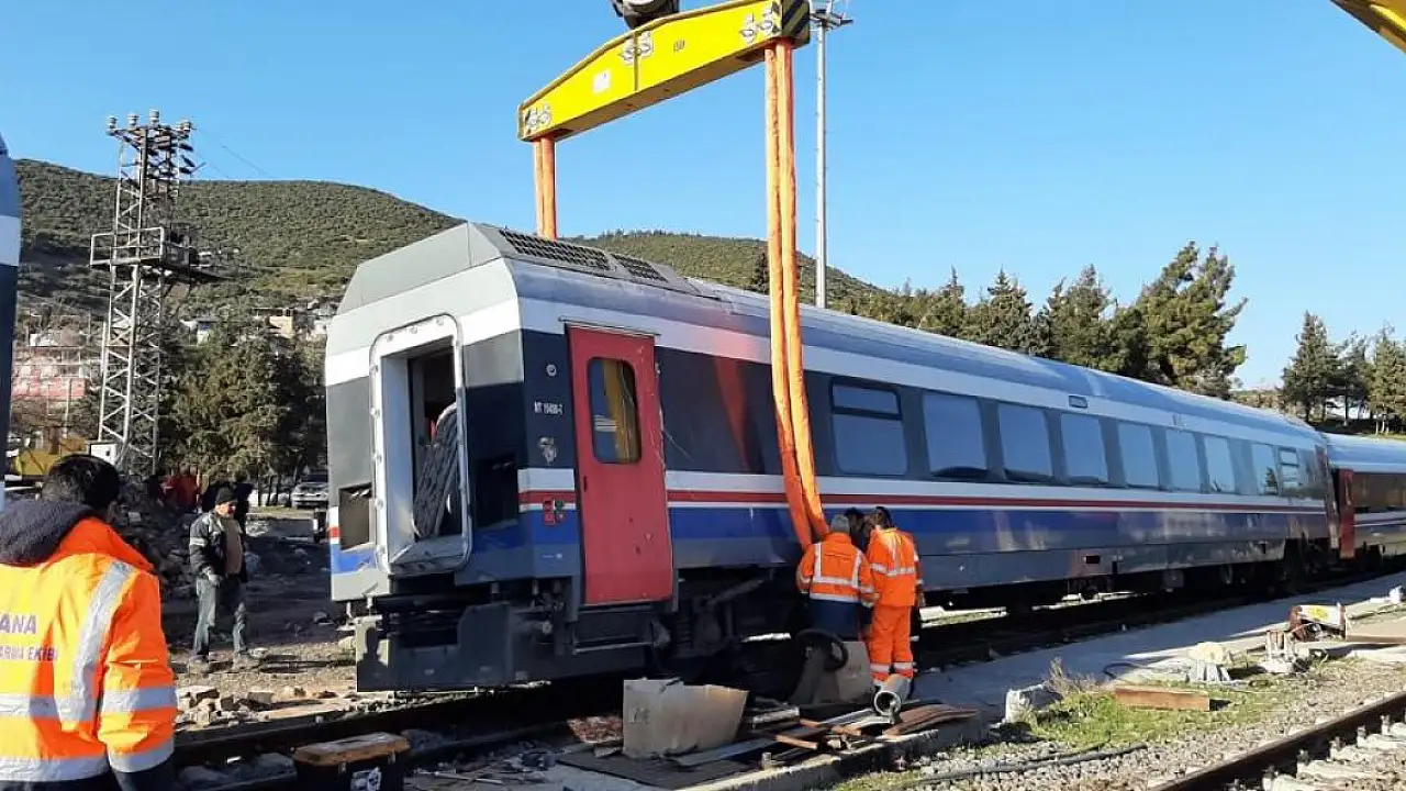 GAZİANTEP'te deprem sırasında devrilen bakım istasyonunda park halindeki 6 tren, ekiplerin çalışmalarıyla kaldırıldı.