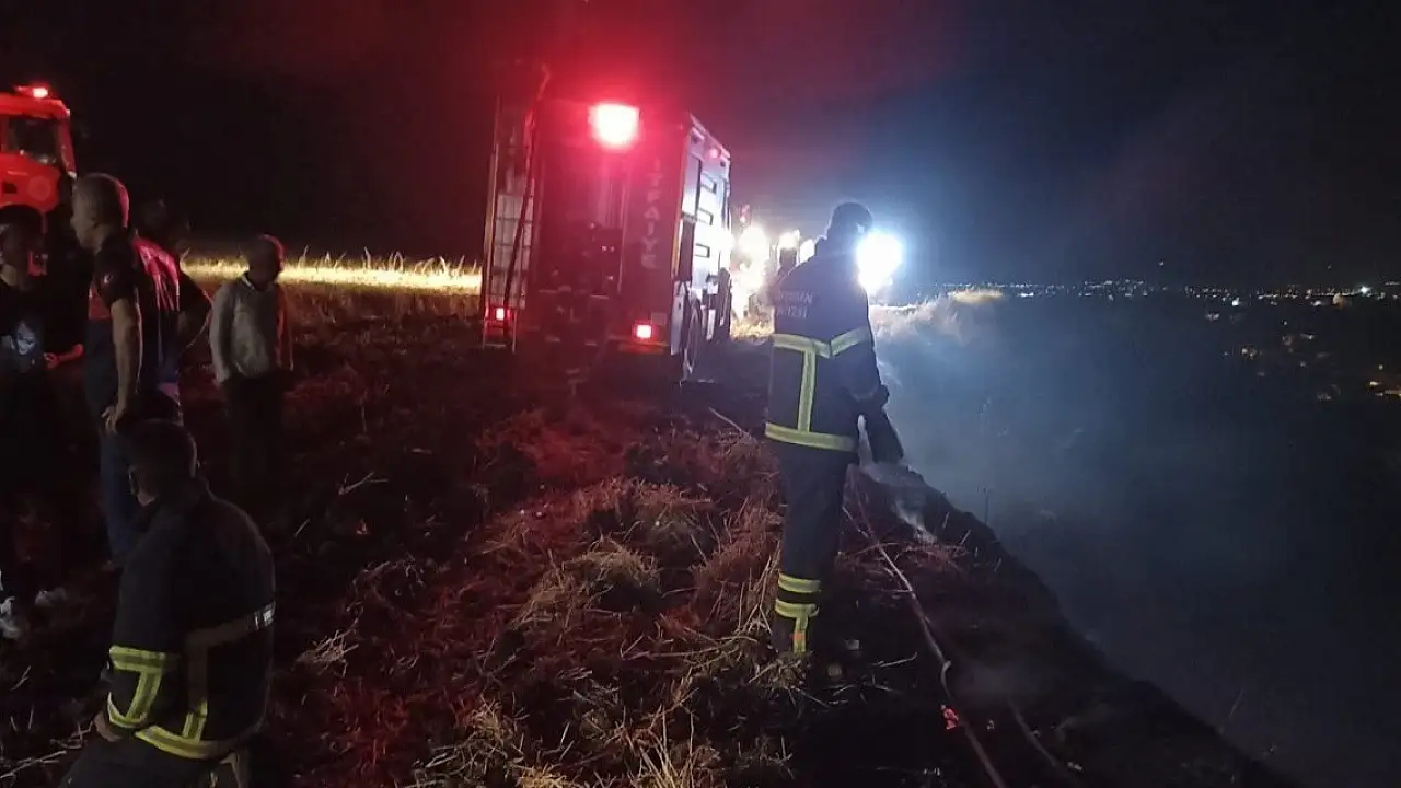 6 Şubat depreminde ağır hasar alan Adıyaman'da, 136 dönümlük arpa tarlasında çıkan yangını duyanlar alevlere müdahale etmek için koştu. Yaklaşık 100'e yakın traktörün alevlerin önünü kesmek için geldiği olay yerinde yangını duyan istirahatteki polislerde söndürme çalışmalarına ayaklarındaki terliklerle yetişti.