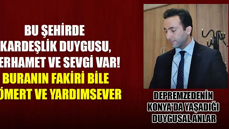 İlk defa bir camide cemaat ve omuz omuza kardeş olduğunu hissettiğini ve namazın tadını aldığını söyleyen Depremzede Sinan Taşdemir,” Şimdi siz değerli büyüklerim ve kardeşlerim bana: "Neden bu kadar Konya'lılardan bahsediyorsun, amacın ne?" diyeceksiniz. Bugün Selçuklu Belediyesi'nin oradan Cuma Namazını edâ için bir camiye geçtim. İmam hatip efendi öyle güzel vaaz ve hutbe verdi ki, duygulandım. Duâlar etti ve depremzedelerin gıyabında cenaze namazı kıldırdı. Hutbede, koca cemaate: depremzedelere kiralık evleri olursa vermelerini, kirayı yükseltmemelerini ve yardımcı olmalarını söyledi. İlk defa, bir camide cemaat ve omuz omuza kardeş olduğumu hissettim. Namazın tadını da aldım. Oysaki cemaatte her kesimden insan vardı ve anladım ki buranın insanı birbirine kenetlenmişti. Caminin adının Selçuklu Merkez Camii ve Hocamızın adının Hidayet olduğunu öğrendim. Ellerini öpmek nasip oldu” dedi.