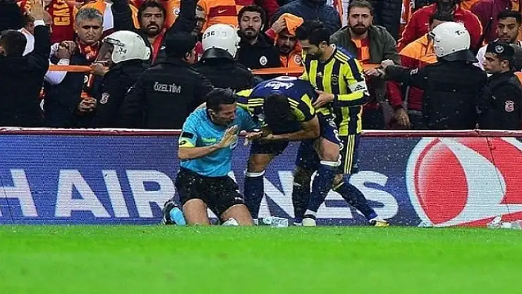 Spor Toto Süper Lig 9. haftasında oynanan Galatasaray-Fenerbahçemaçının ikinci yarısında gergin anlar yaşandı. Yan hakem kafasına gelen madde nedeniyle yerde kaldı.