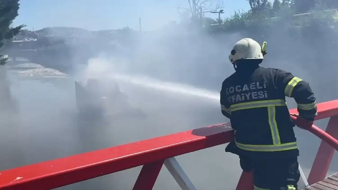 Kocaeli'de dere yatağındaki kepçe alev alev yandı. Yangını itfaiye ekipleri söndürdü.
