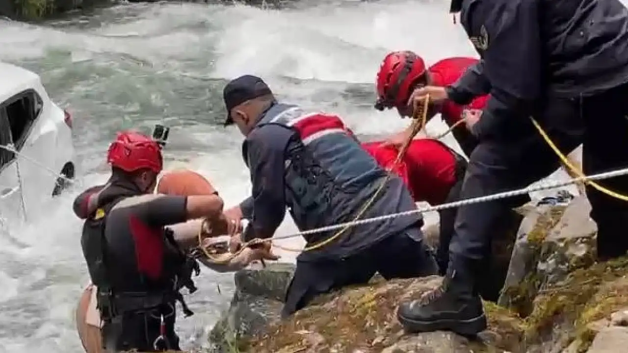 RİZE'nin Çamlıhemşin ilçesinde otomobil, virajda dereye uçtu. Suya gömülen aracın üzerine çıkan sürücü Celal Gücer ile eşi Zeynep Gücer, gelen ekipler tarafından uzatılan halatla kurtarıldı.