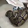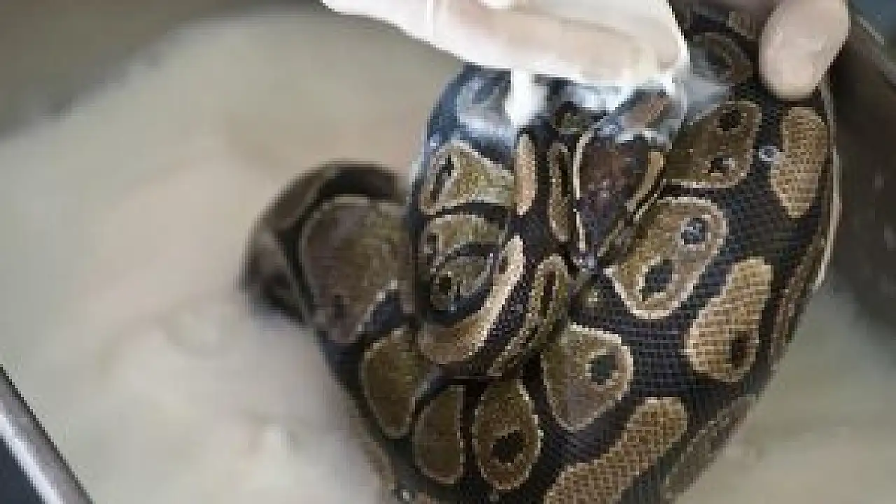 Gaziantep Hayvanat Bahçesi'nde, deri değişimlerini kolaylaştırmak için yılanlara bakıcıları tarafından süt banyosu yaptırılıyor.